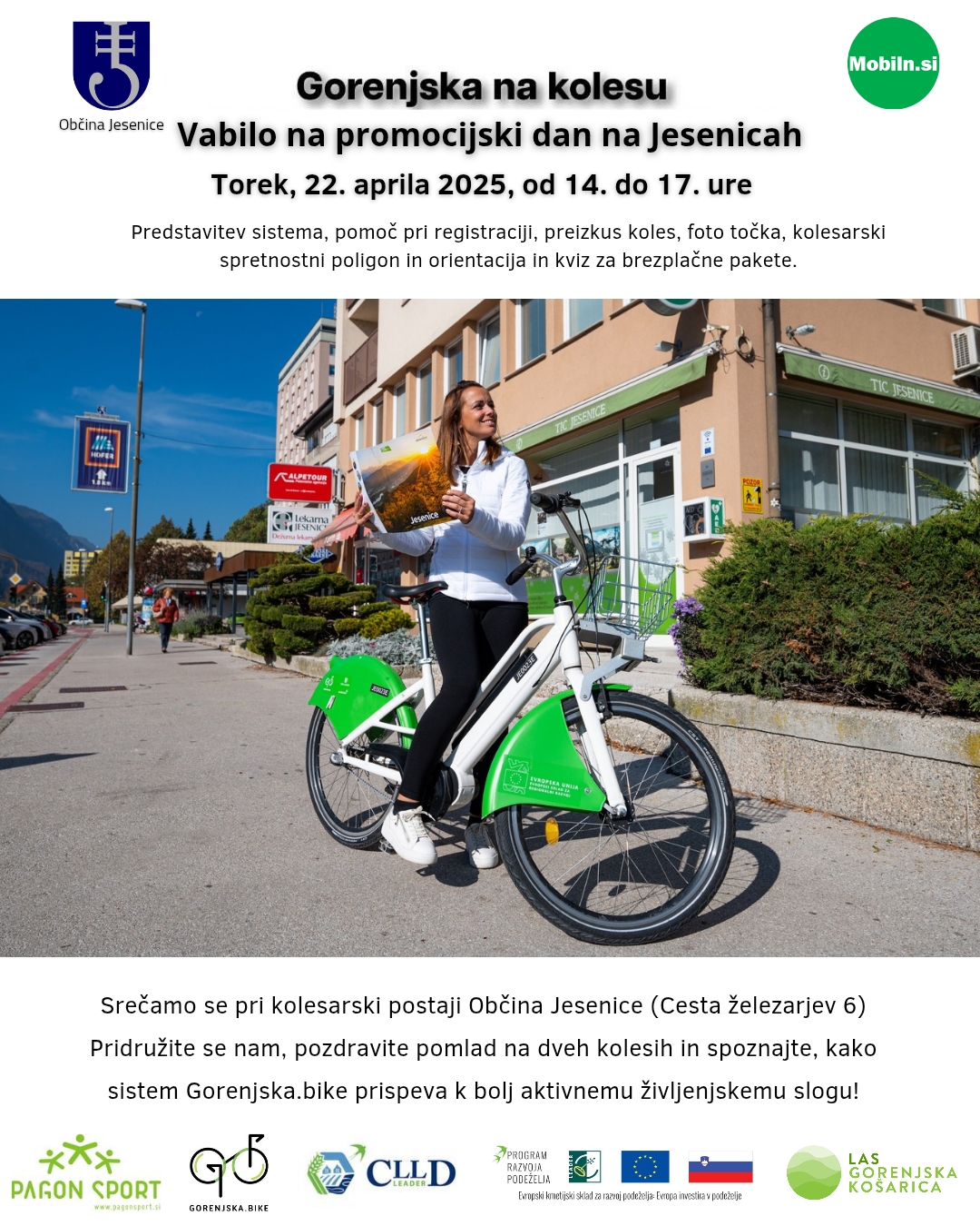 Center za trajnostno mobilnost (CTM) in MM IBIS v sodelovanju s Pagon Športom vabita občane gorenjskih občin, da se v torek, 22. aprila 2025, ob Svetovnem dnevu Zemlje pridružijo predstavitvi sistema izposoje koles Gorenjska Bike. Ta sistem povezuje deset gorenjskih občin in spodbuja trajnostni način življenja ter aktivno mobilnost pri vsakodnevnih opravilih. Trajnostno mobilnost in vožnjo s kolesom bosta podprla kolesarja Laura Šimenc in Nejc Črnilogar, ki bosta s kolesom obiskala vse občine sistema Gorenjska Bike. Laura Šimenc se bo ustavila na Jesenicah med 15.20 in 15.50 uro, dogajanje pred Občino Jesenice pa se bo začelo že ob 14. uri.
