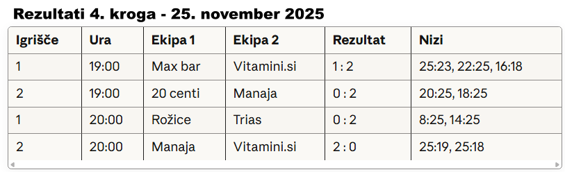 Na vrhu lestvice po četrtem krogu še vedno suvereno vladajo Manaja s 16 točkami. Tik za njimi sta se na drugo mesto prebili ekipi Vitamini.si in 20 centi, obe s 14 točkami. Vitamini.si imajo sicer nekoliko boljši količnik setov. Trias na četrtem mestu so pri 9 točkah. Max bar je z zmago prišel do pomembnih točk in se s 7 točkami drži na petem mestu, medtem ko Rožice še vedno iščejo prvo zmago sezone.
