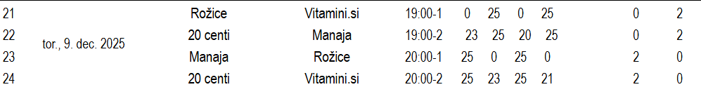Jeseniška rekreativna liga v odbojki se je v torek, 9. decembra 2025, nadaljevala s šestim krogom, ki je bil odigran le delno. Ekipa Rožice ni mogla nastopiti, zato sta bili dve tekmi registrirani z rezultatom 2:0 v korist nasprotnikov. Kljub temu sta bili odigrani dve zanimivi tekmi, v katerih so 20 centi presenetili drugouvrščene Vitamini.si, vodilni Manaja pa so nadaljevali z zmagovalnim nizom.