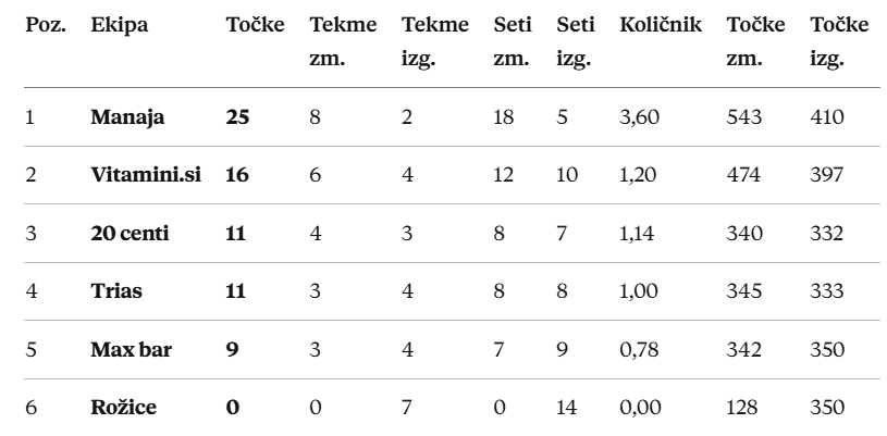 Manaja s 25 točkami suvereno vodijo na lestvici in imajo že solidno prednost pred drugouvrščenimi. Vitamini.si z 16 točkami ohranjajo drugo mesto, kljub porazu z 20 centi. Na tretjem mestu sta z 11 točkami 20 centi in Trias, pri čemer imajo 20 centi boljši količnik. Max bar z 9 točkami sledijo na petem mestu, Rožice pa – zdaj tudi zaradi neodigranih tekem – še vedno nimajo osvojene nobene točke.