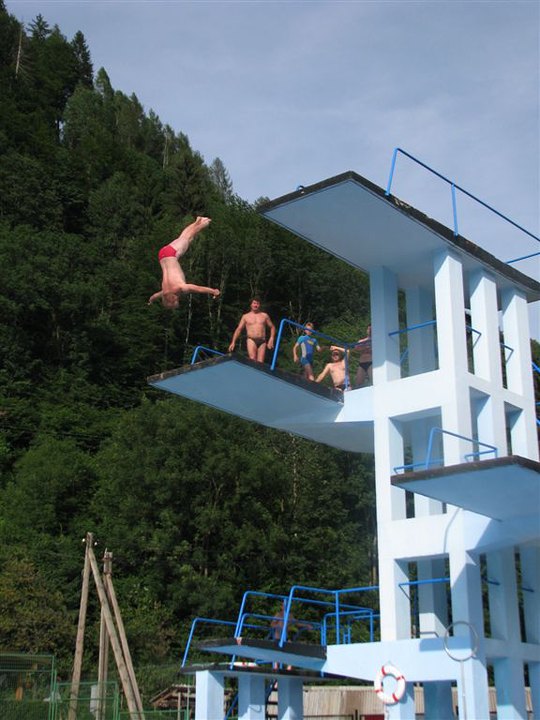 Nedelja 24.6. pa je bila visokoleteča, saj je bilo na sporedu tekmovanje v skokih v vodo. Pred tekmovanjem so skakalci in nekateri ljubitelji skokov organizirali tudi poučni seminar za skoke v vodo, na katerem sta imela glavno besedo g. Janez Obšteter in g. Beno Pahor. Skokov se je udeležilo 10 skakalcev. Vsi so imeli 3 obvezen skoke in 2 poljubna, tako da je za tekmo štelo kar 5 skokov vsakega skakalca. Poleg tekmovanja je bil tudi pester spremljevalni program: prikaz vadbe Fly Box, nastop skupine Arthem, pevski nastop Neže Witwicky in Maše Kocjančič.