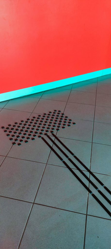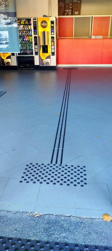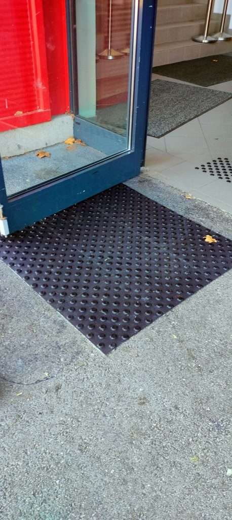Pred vhodom v dvorano smo namestili reliefne talne oznake – taktilne plošče, ki uporabnikom s pomočjo bele palice omogočajo zaznavanje prilagojenih kapacitet. Oznake obiskovalce vodijo od vhoda do recepcije, kjer lahko prejmejo nadaljnje informacije in pomoč. Proti zdrsni trakovi in obloge pa poskrbijo za dodatno varnost in preprečujejo morebitne padce ter poškodbe.