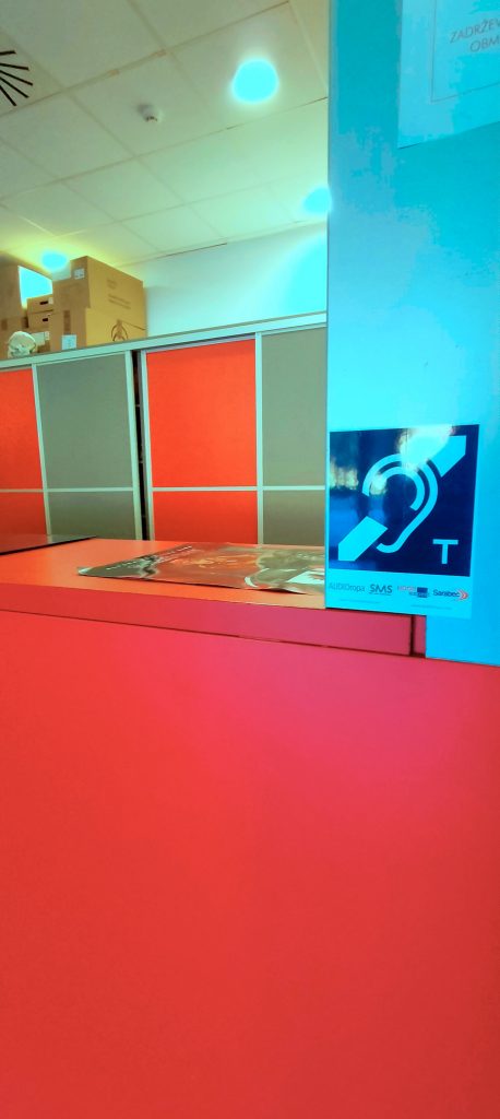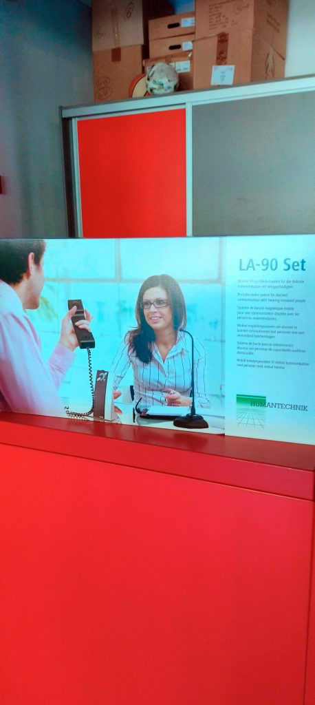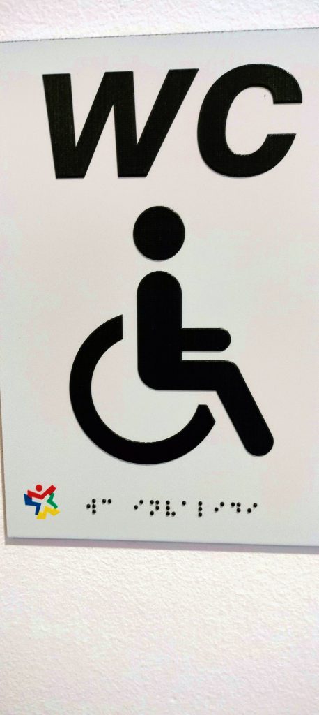 V recepciji je na voljo tudi aparatura, ki pomaga slušno prizadetim obiskovalcem pri komunikaciji. Sanitarije v pritličju smo poleg slikovnih prikazov označili tudi z Braillovo pisavo, kar omogoča neodvisno uporabo tudi za slepe obiskovalce.